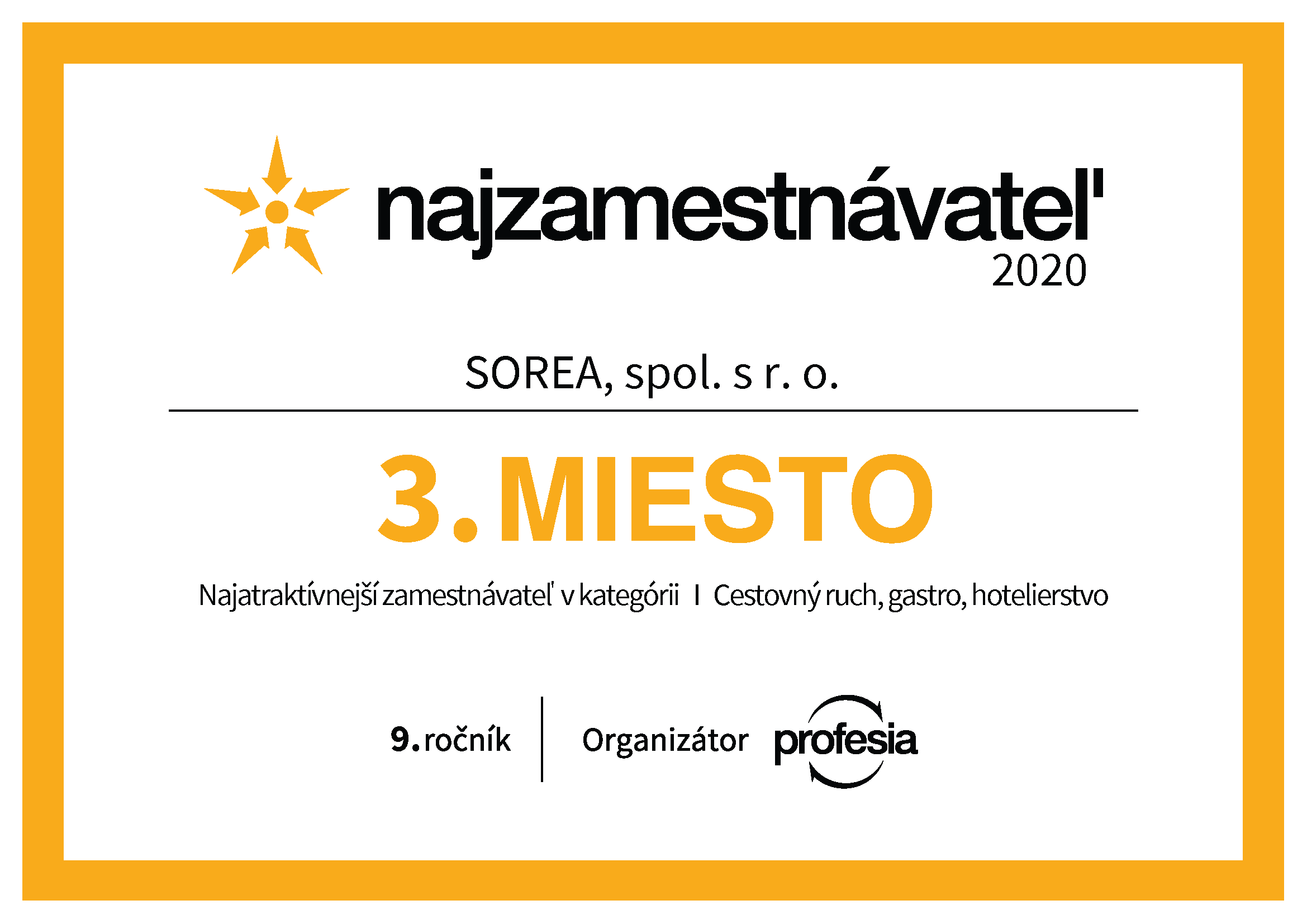 Najatraktívnejší zamestnávateľ je prestížna anketa ktorú každoročne vyhlasuje stabilný pracovný portál Profesia. Jej cieľom je priniesť reálny pohľad uchádzačov i potenciálnych zamestnancov na Slovensku na to, ako vnímajú firmy, ich benefity a imidž. Umiestnenie v tejto ankete je dôkazom toho, že aj naši zamestnanci dokážu oceniť prístup a pracovné prostredie, ktoré im SOREA poskytuje.