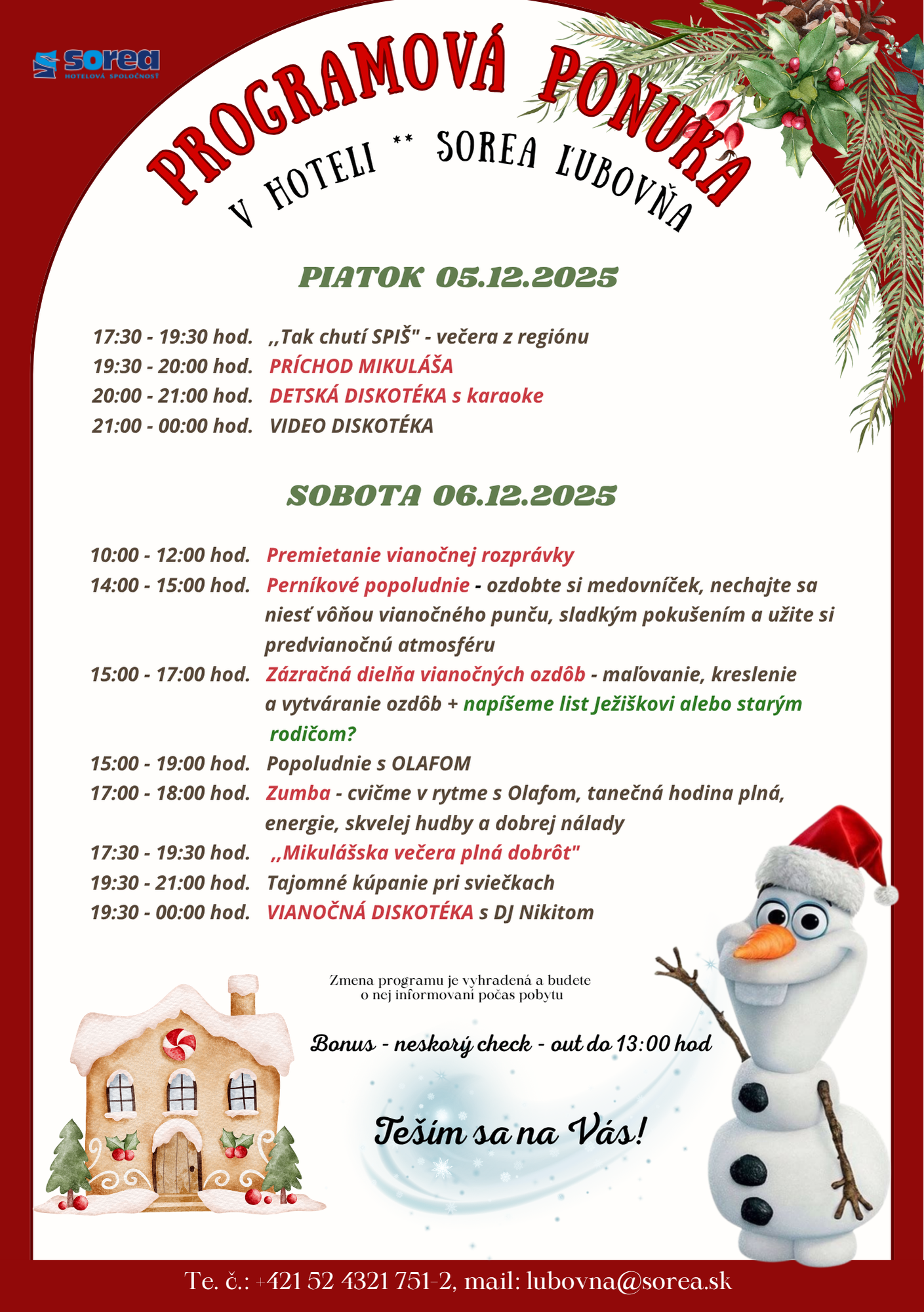 animačný program (deti sa môžu tešiť na: perníkové popoludnie, zázračnú dielňu vianočných ozdôb, fotenie s Mikulášom a anjelom, večerné rozprávky, diskotéku...)