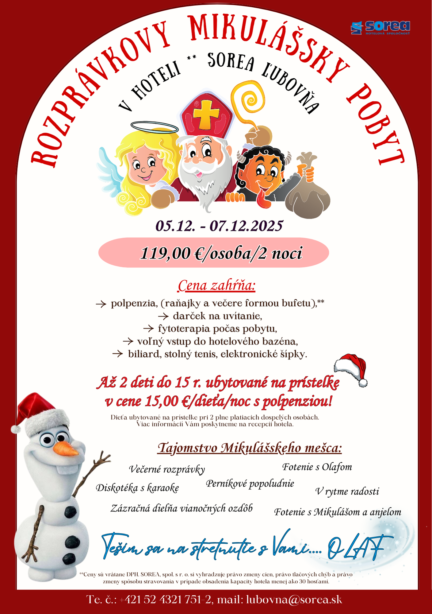 Tento tematický, je venovaný predovšetkým deťom ale aj dospelí si môžu poskytnúť zázraky tohto obdobia plného. Mikulášsky pobyt zahŕňa pohodlné ubytovanie v krásnom prostredí Ľubovnianskych kúpeľov. Jedným z hlavného programu pobytu je stretnutie s Mikulášom. Deti sa môžu tešiť aj na vianočné dielničky, rôzne hry, súťaže...a na OLAFA.
